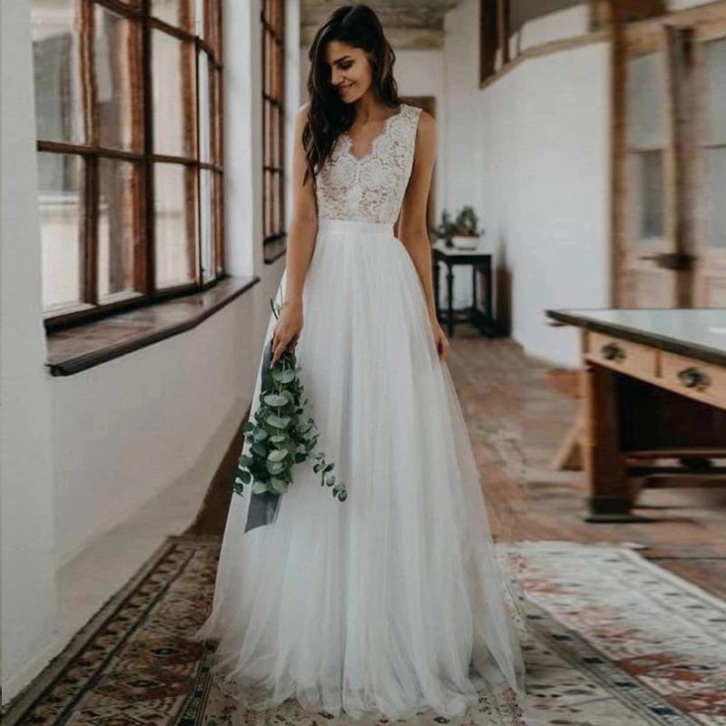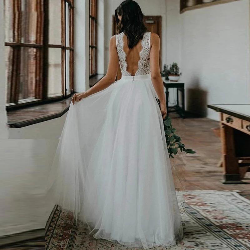 Bohemian Lace Wedding Dress Elegant V-neck Sleeveless Soft Tulle Beach Boho Bridal Gowns