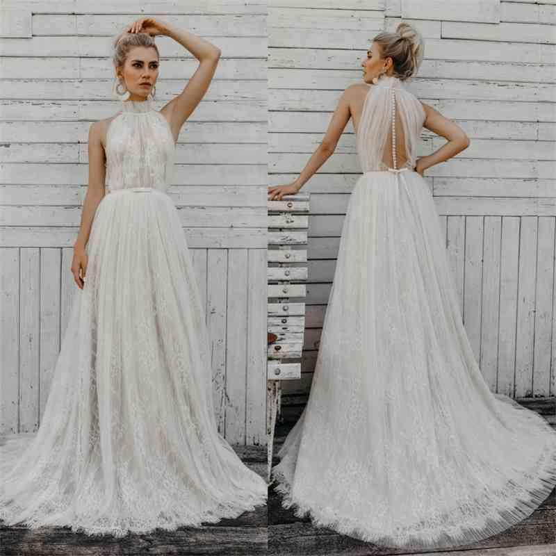 Summer Bohemian A Line Wedding Gowns High Neck Sleeveless Plus Size Sweep Train Lace BOHO Beach Bridal Party Dresses