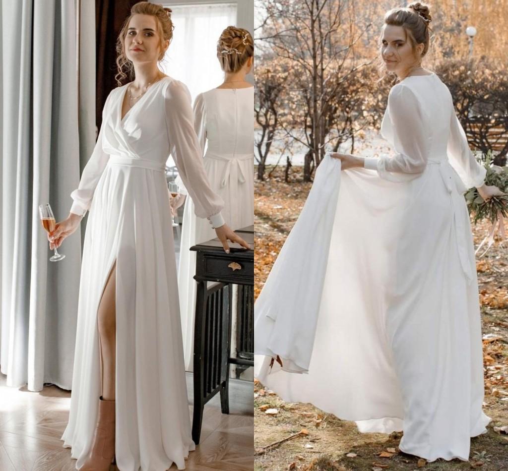 Boho Wedding Dress Chiffon Split Floor length Long Sleeve V-Neck Charming Robe De Mariee With Sash bow Beach Rustic