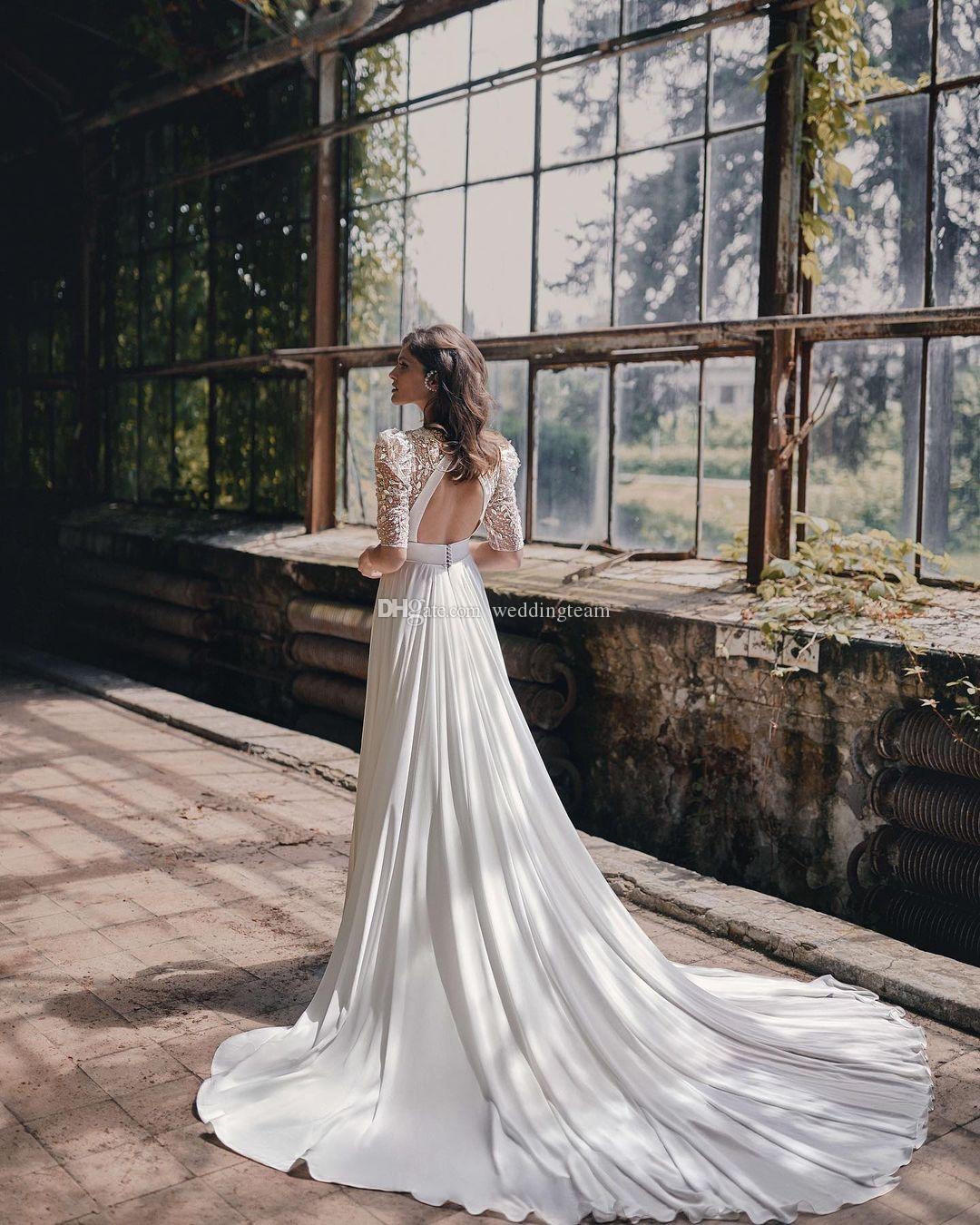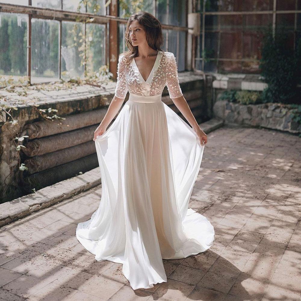 Stunning Beading Backless Wedding Dresses V Neck Beach Bridal Gowns Short Sleeves Appliqued A Line Sweep Train
