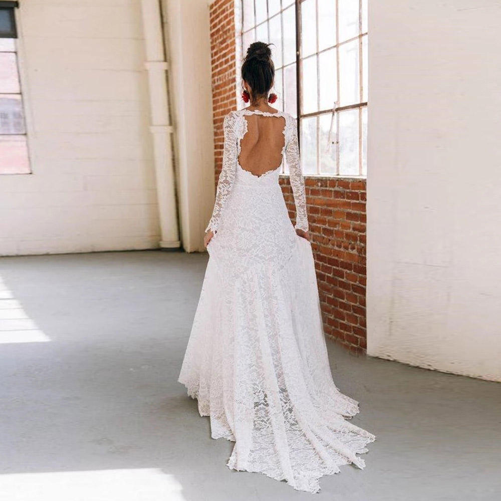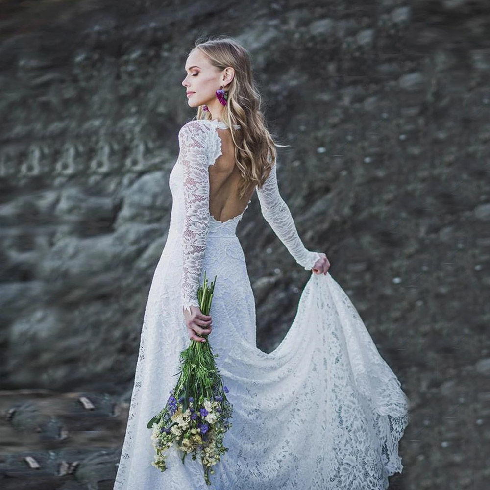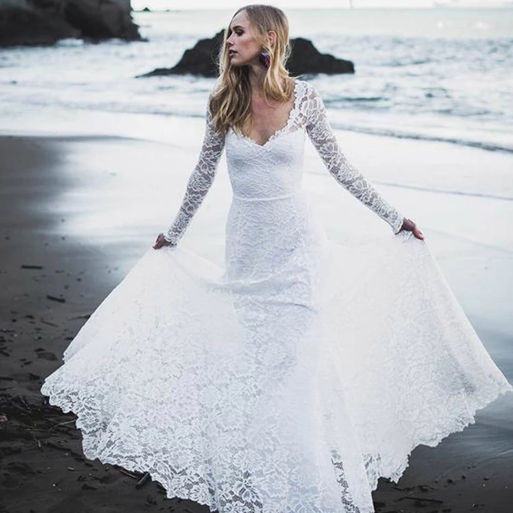 A Line Wedding Dresses Lace V Neck Beach Bohemian Long Sleeve Bridal Gowns