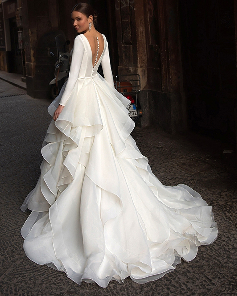 Boho Luxury Elegant Wedding Dresses Asymmeterical V-Neck Long Sleeve Backless Button Chapel Train
