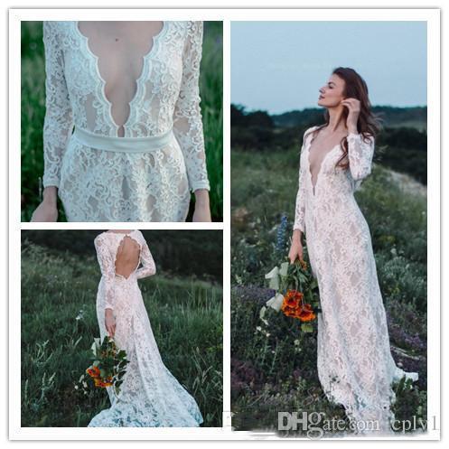 A Line White Lace long Sleeves Beach Bohemian Wedding Dresses Bridal Gown