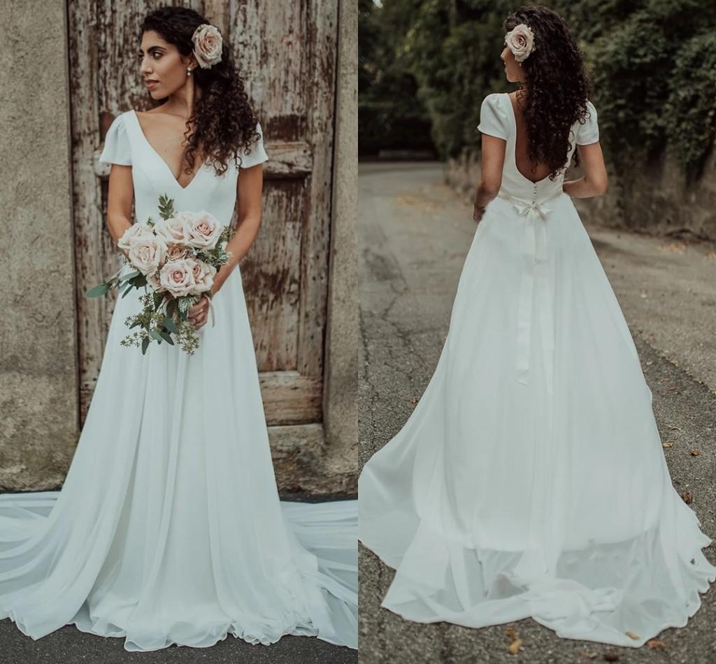 Boho Country A Line V Neck Chiffon Wedding Dress Simple Beach Short Sleeves Sexy Open Back Sash Bridal Gowns