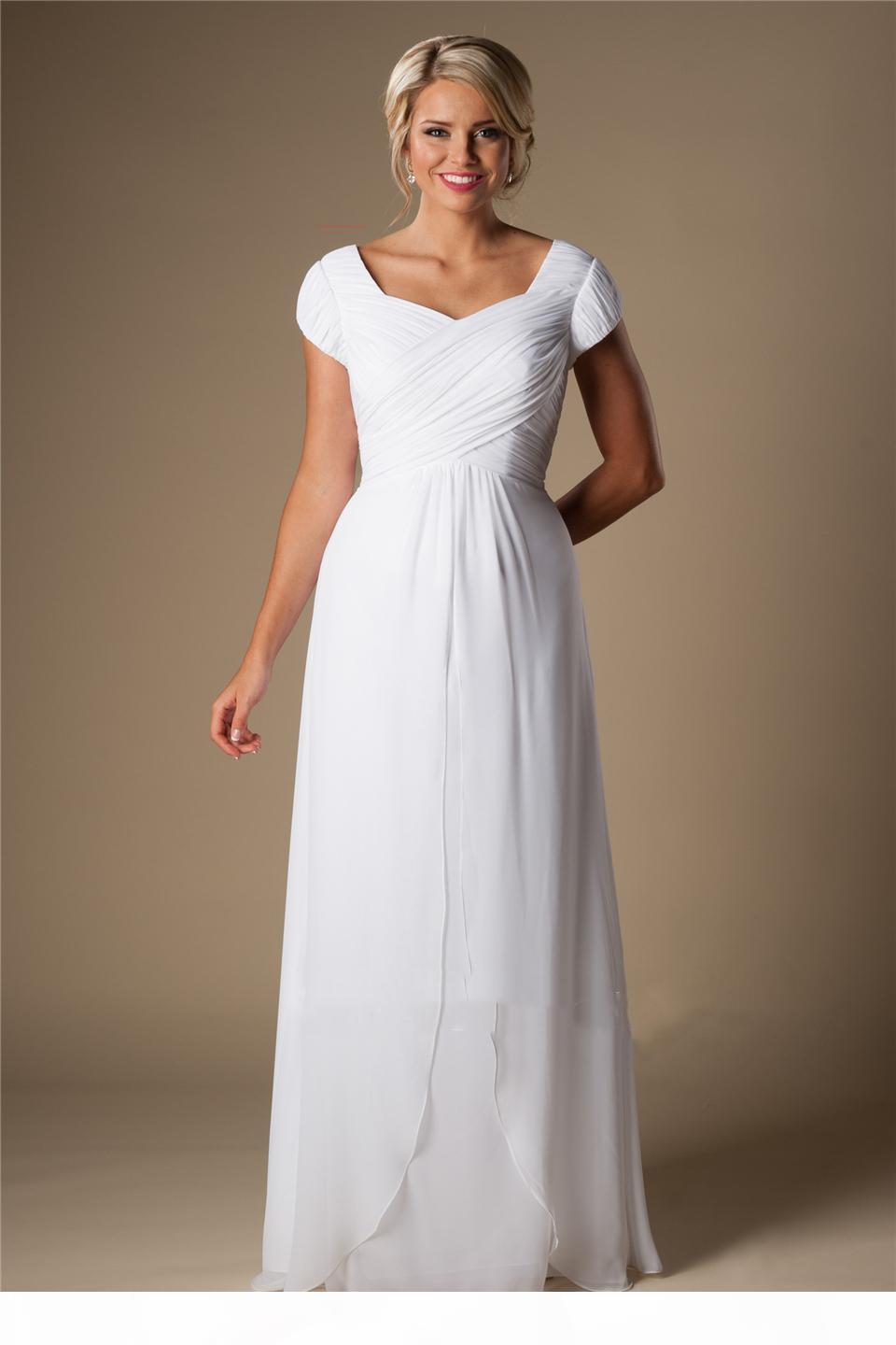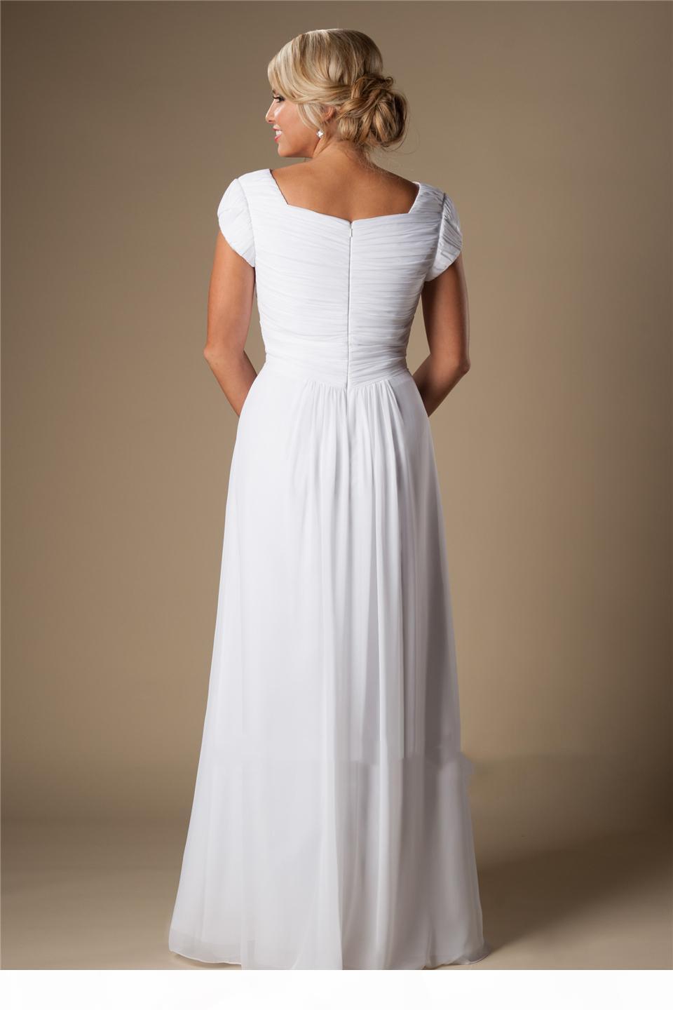 Informal Ruched Chiffon Modest Cap Sleeves Wedding Dresses With Sleeves Queen Anne Neck Bridal Gowns A-line Simple Reception Wedding Gowns