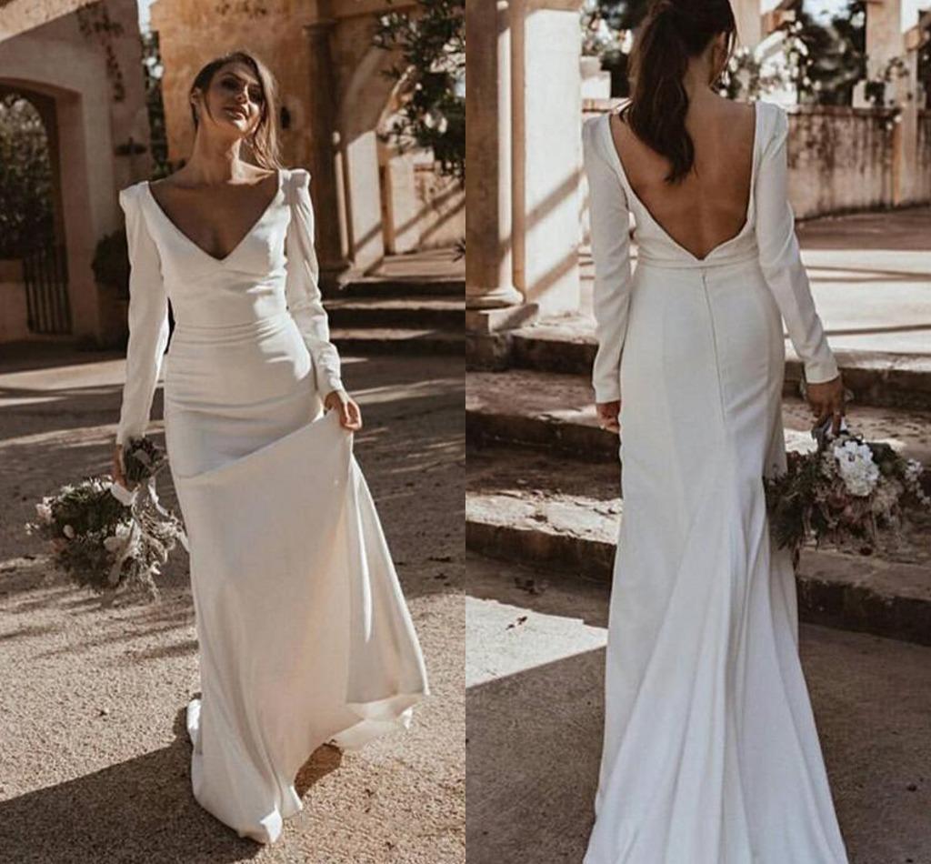 Simple Satin Sheath Wedding Dresses Long Sleeve Country Backless Sweep Train Boho Bridal Gowns