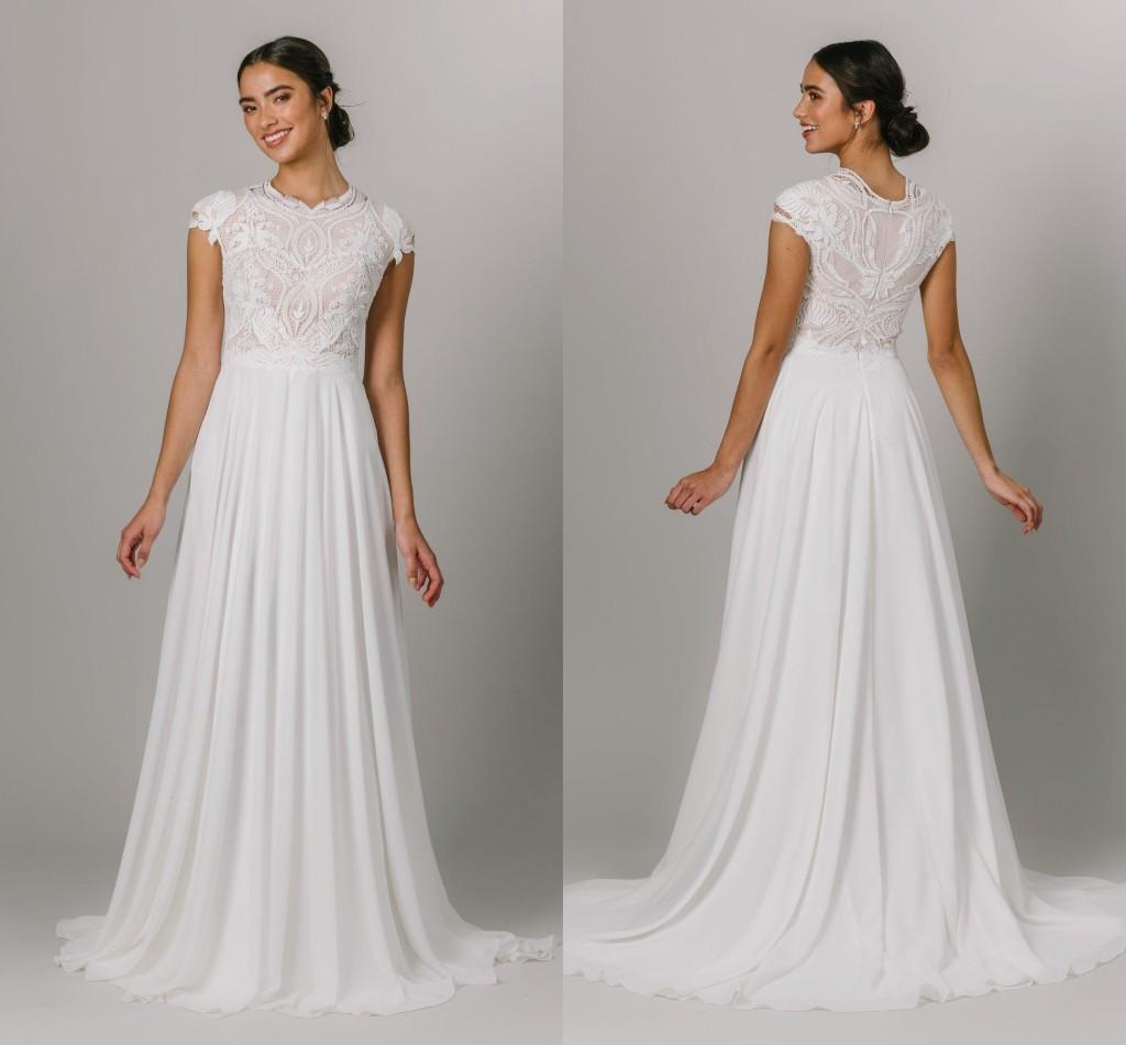 Summer Beach Chiffon A Line Bridal Gowns Lace Jewel Neck Cap Sleeves Sweep Train Boho Wedding Dresses