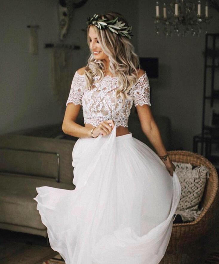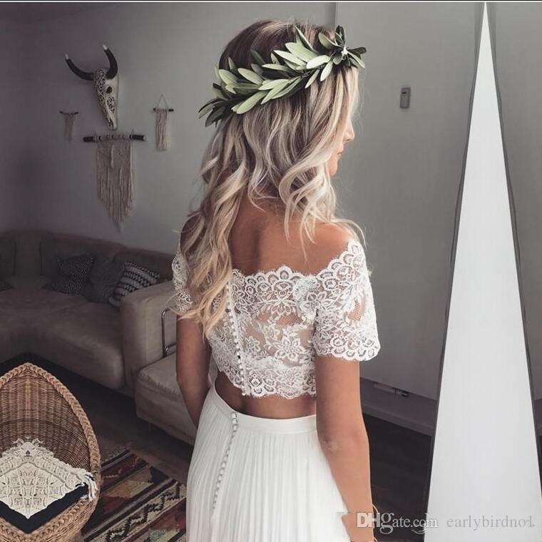 Two Pieces Summer Beach Country Wedding Dresses Chiffon A Line Short Sleeve Boho Lace Bridal Gowns