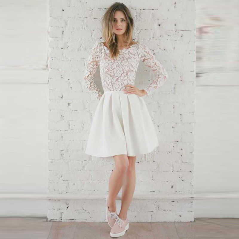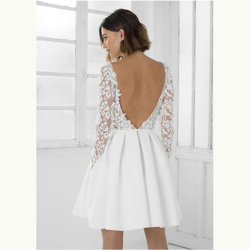 Modern Sexy Short Lace Backless Bridal Wedding Dresses Long Sleeves Jewel Neck Wedding Gowns