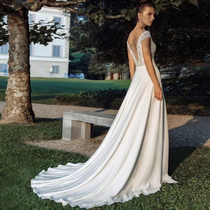 Sheer Neck Boho Wedding Dress Simple Cap Sleeves Chiffon Beach Bride Dress Bridal Gown