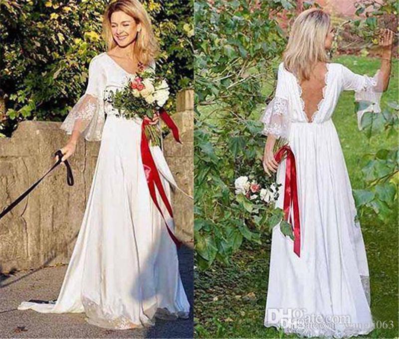 Boho Long Sleeve Lace Wedding Dresses V Neck A Line Sexy Backless Chiffon Beach Garden Bridal Gown
