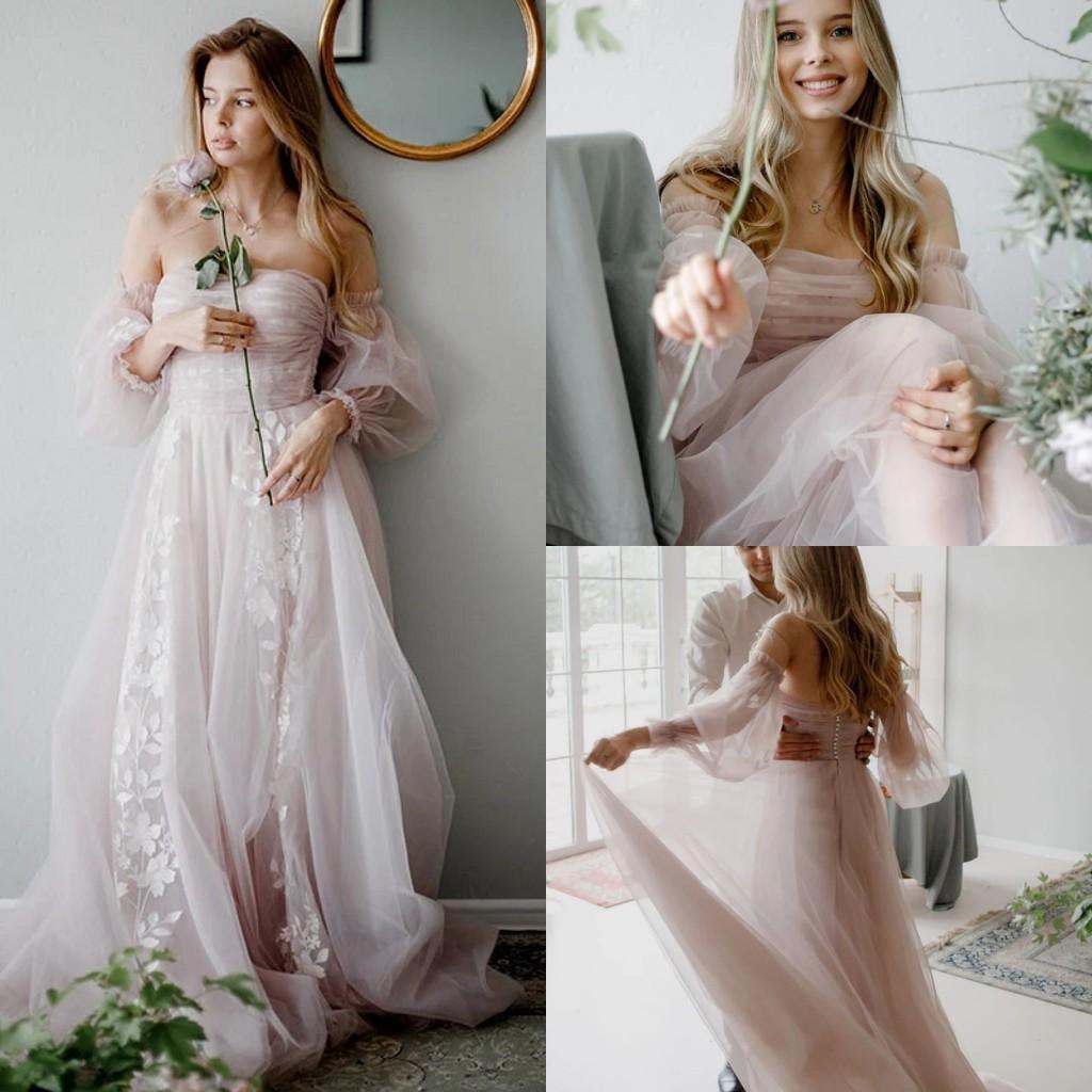 Light Blush Pink Wedding Dresses A Line Soft Tulle Lace Appliqued Strapless Boho Bridal Gowns