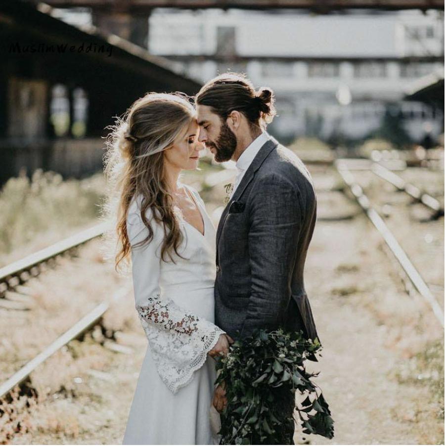 Long Sleeve Dubai White Wedding Dresses With Lace Modest Simple V Neck Rustic Civil Boho Wedding Dress