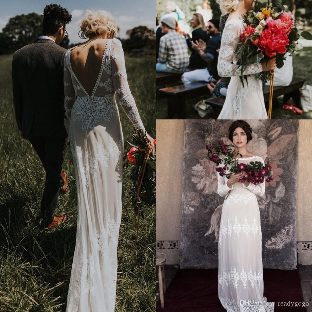 Vintage Lace Applique Bohemian Country Long Sleeve Wedding Dresses Modest Low Back Applique Edge Garden Beach boho Wedding Gown