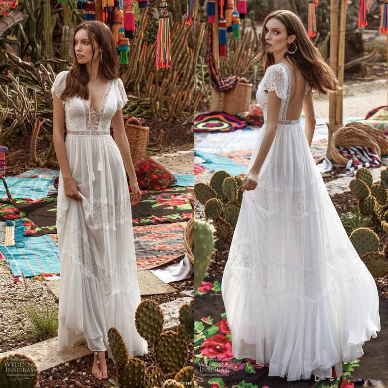 Summber Behomian Wedding Dresses Short Sleeve V Neck Lace Appliques Beaded Boho Robes De Mariée Custom Made Bohemian Bridal Dress