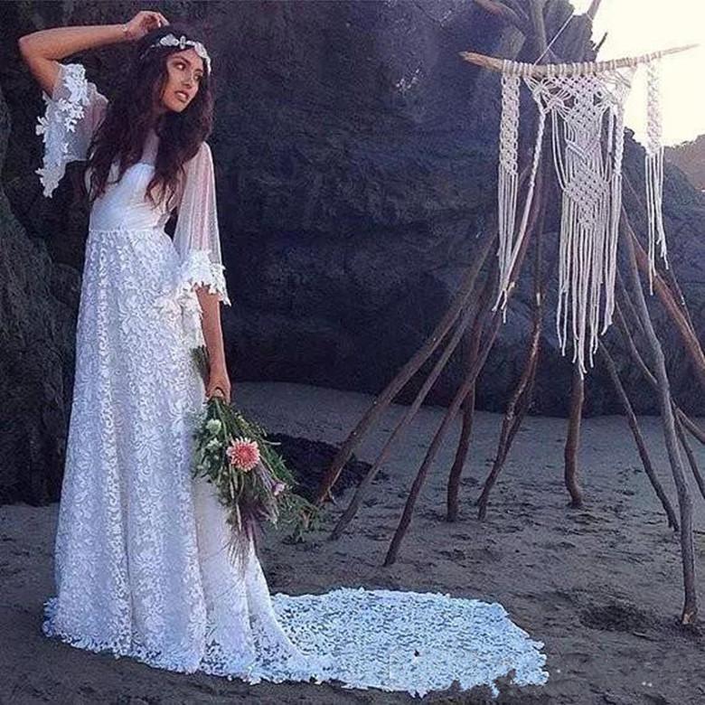 Vintage Bohemian Wedding Dresses A Line Sheer Back Bride Gowns Sweep Train Half Sleeves Elegant Bridal Gowns