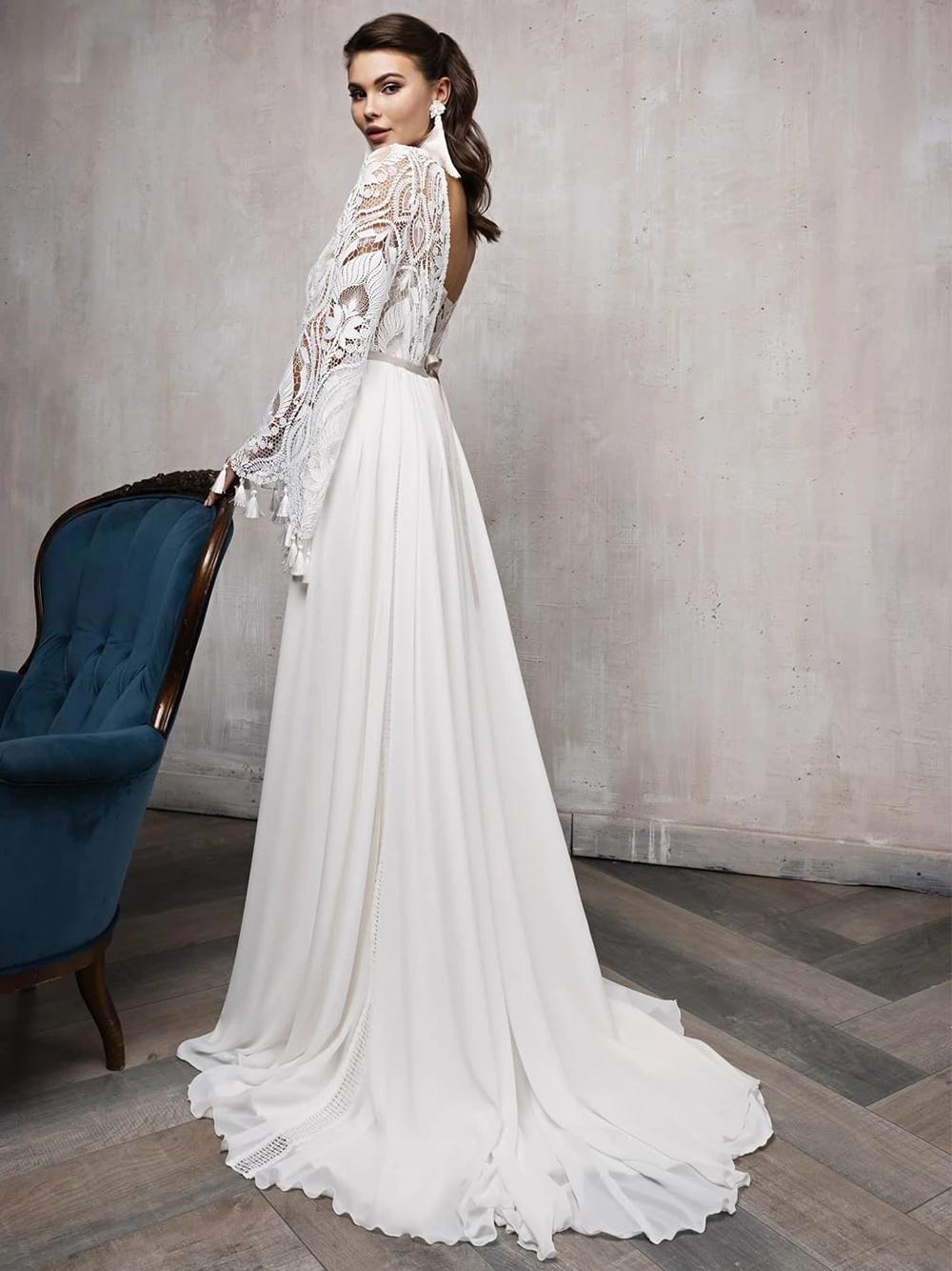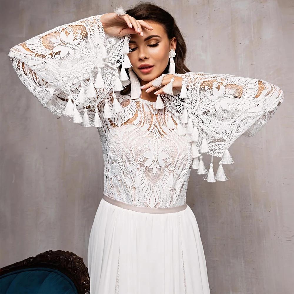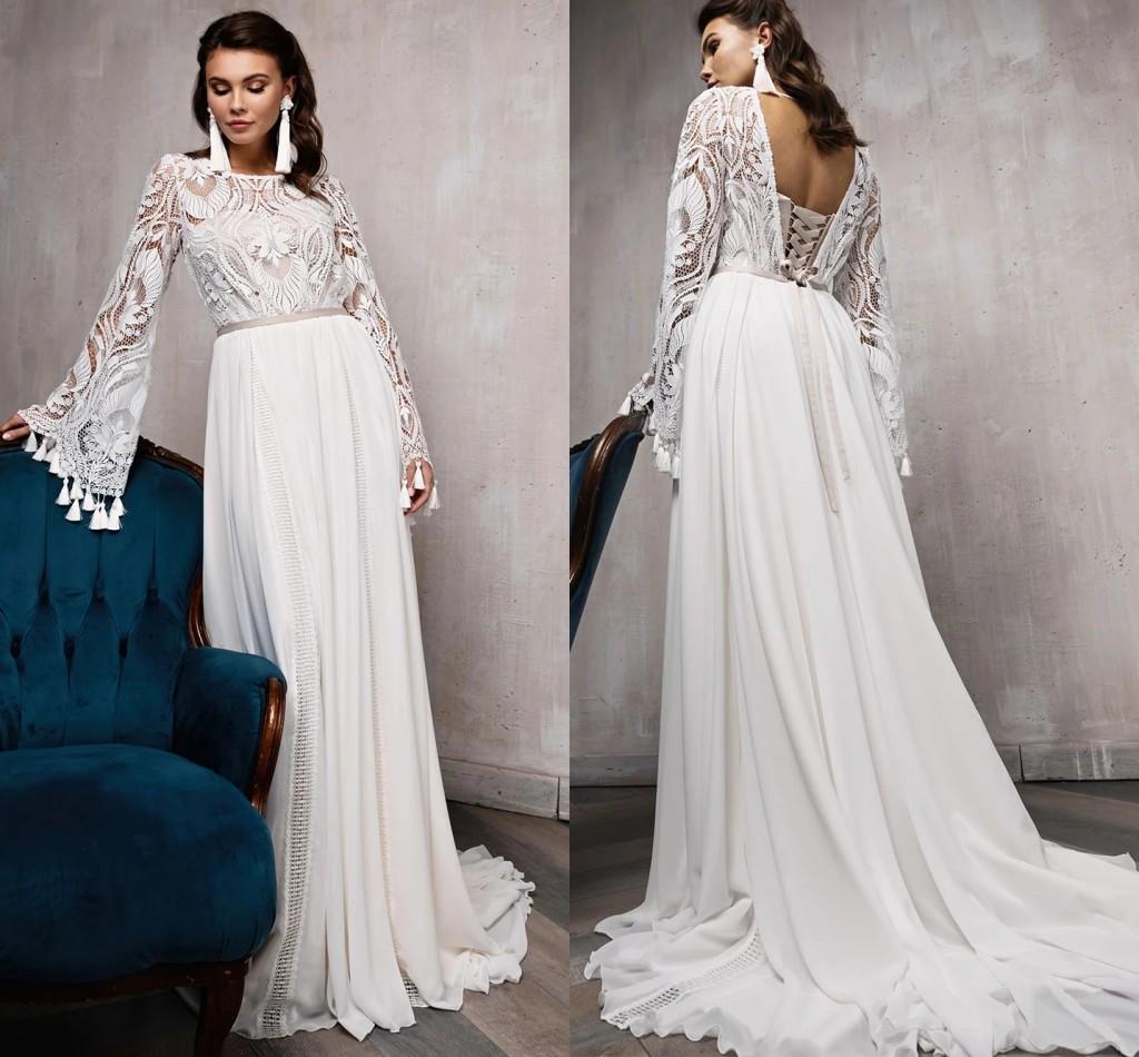 Boho Cut-Out Lace Beach Wedding Dress Princess Long Sleeves Lacing Corset Backless Bridal Gowns