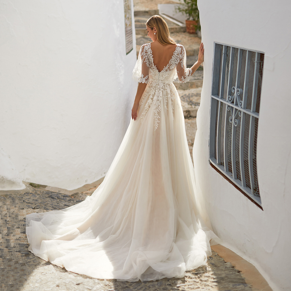 Romantic Boho Wedding Dress Flare Short Sleeves V Neck Lace Applique Tulle Backless Bridal Dress