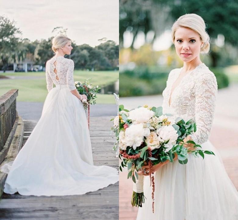 Modest Bohemian Wedding Dresses Lace Deep V-neck 3/4 Long Sleeves Vintage Country Bridal Gown
