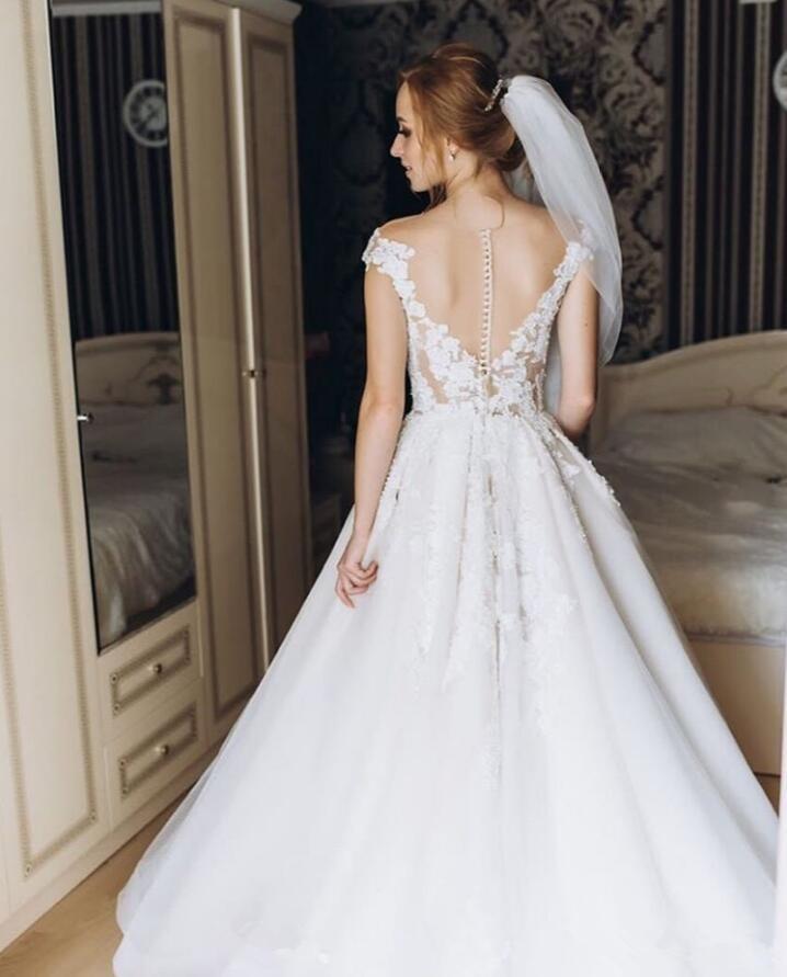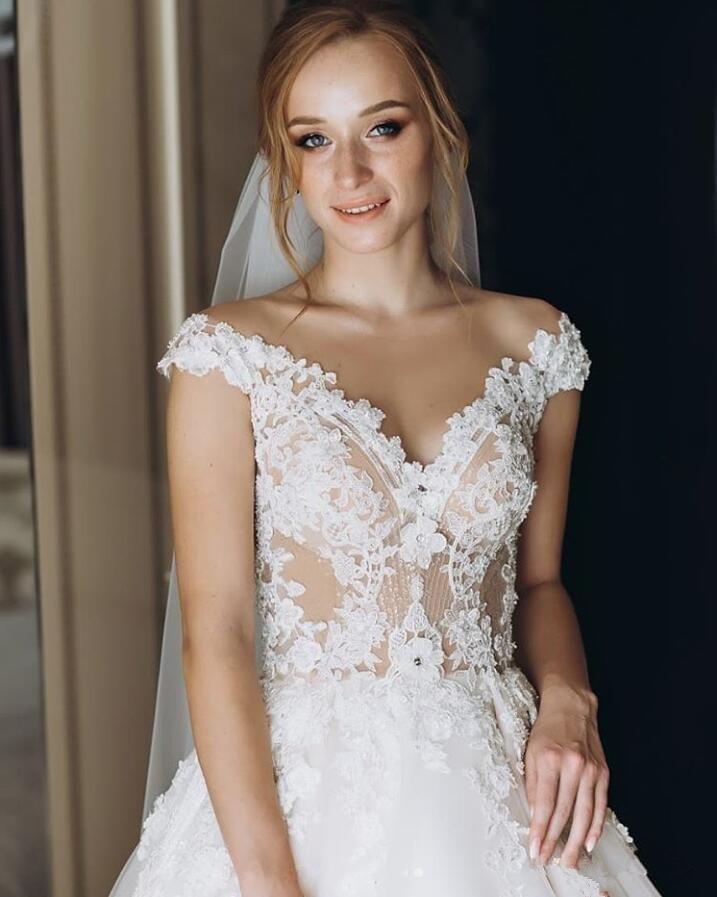 Champagne Lace Wedding Dress A Line Illusion Off The Shoulder Appliqued Bridal Gowns