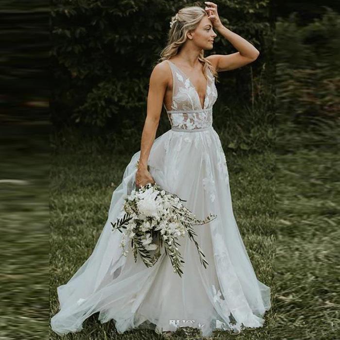 Country Garden Wedding Dress Deep V Neck Backless Lace Appliques A Line Beach Bridal Gowns