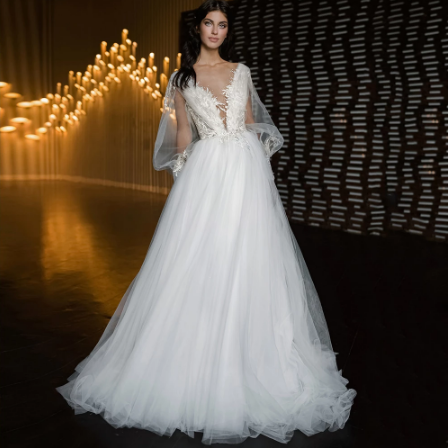 Bohemian Wedding Dress Puffy Sleeve V-Neck Appliques Lace Princess A-Line Tulle Boho Bridal Gowns