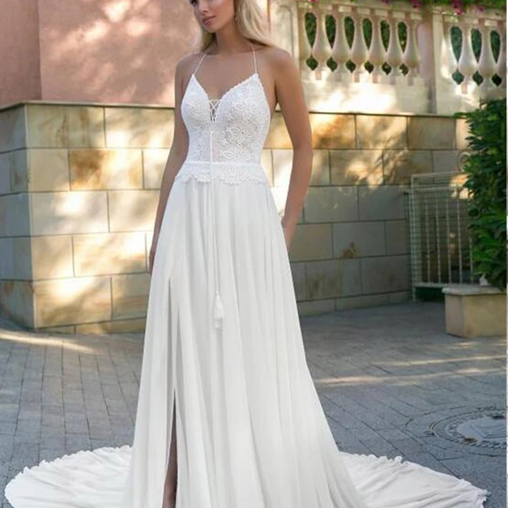 Chiffon A-line Beach Wedding Dress Boho Puff Sleeve Sweep Dot Tulle Bridal Dress