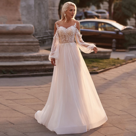 Long Puffy Sleeve Lace Wedding Dress Illusion Back Glitter Tulle Boho Bridal Gowns