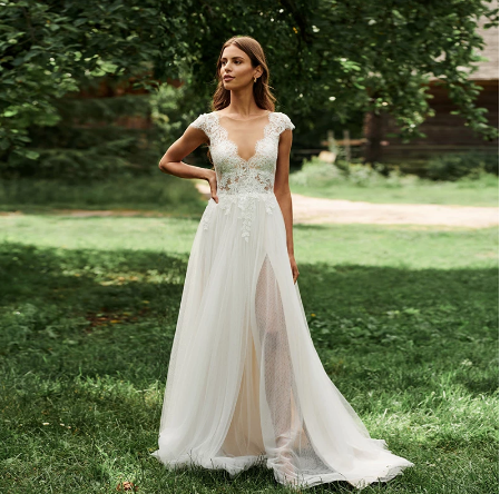 Vintage V Neck Cap Sleeve Bridal Gowns White Lvory Lace Top Tulle Summer Beach Boho Bridal Gowns