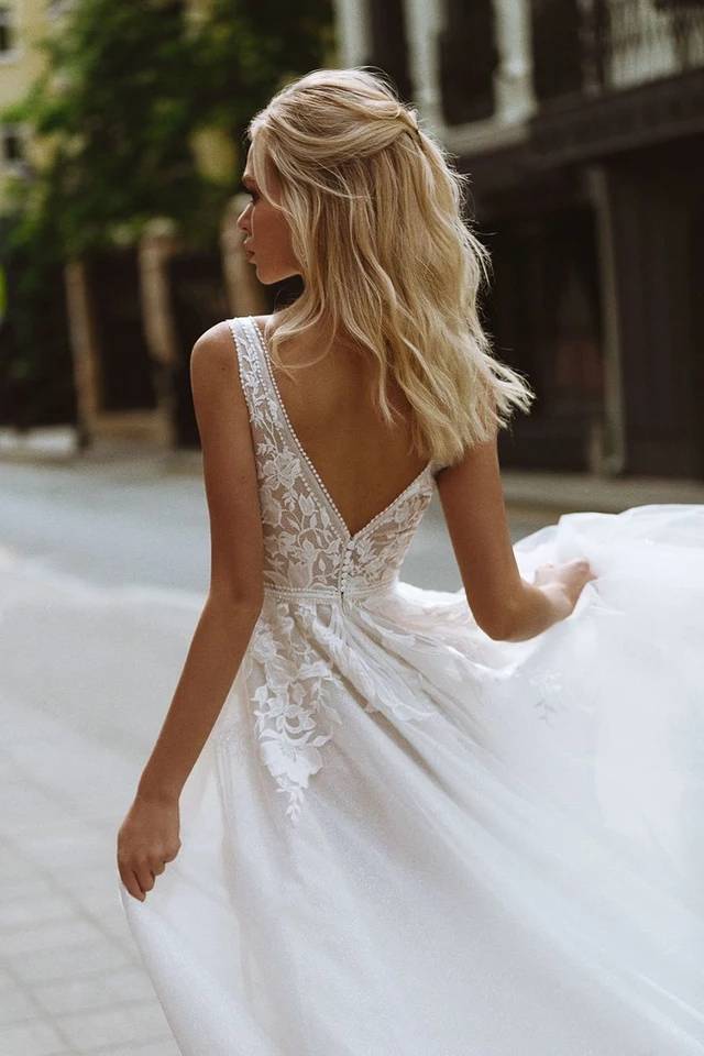 A-line V-neck Tulle Appliques Pearls Boho Dubai Arabic Wedding Gown Bridal Dress