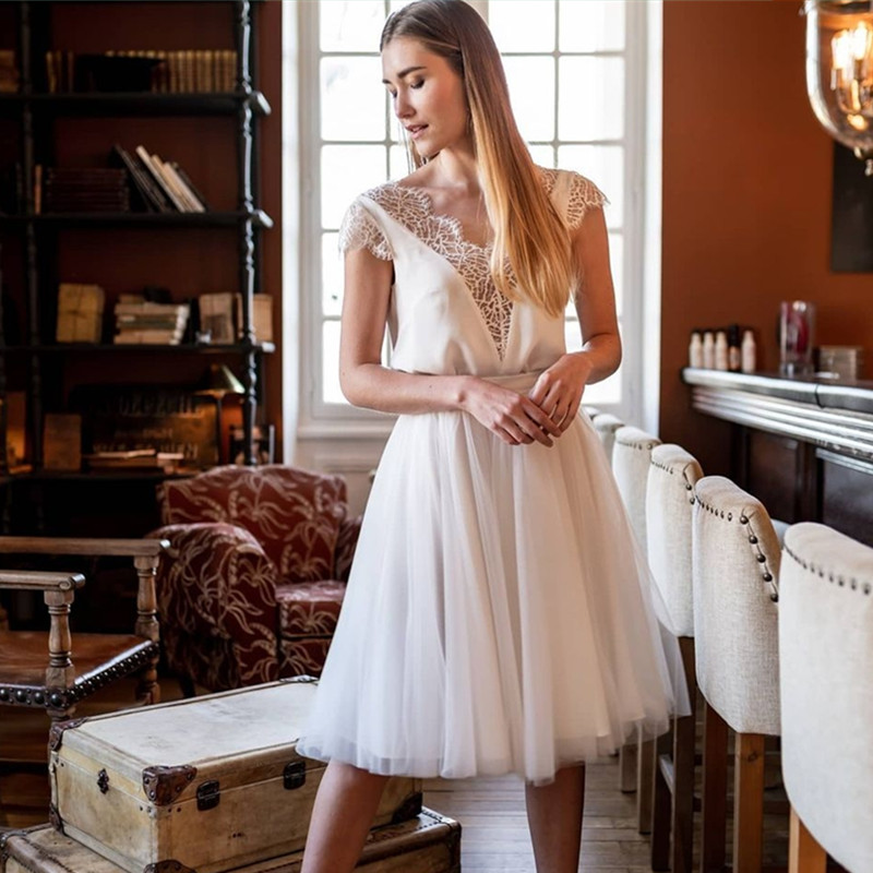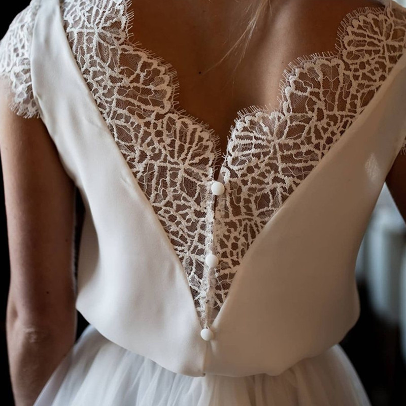 Elegant Short Wedding Dress A-Line Lace Appliques Short Sleeve Button Tulle V-Neck Boho Custom Made Bride Dress