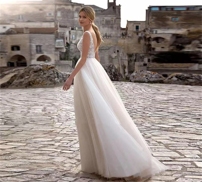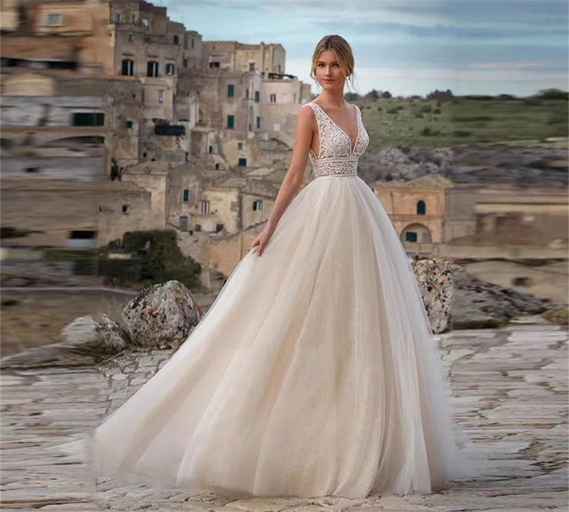 Vintage V-Neck Boho Wedding Dresses Backless Glitter Tulle A-Line Beach Bridal Gowns