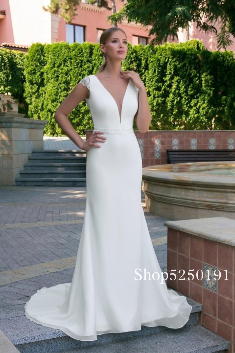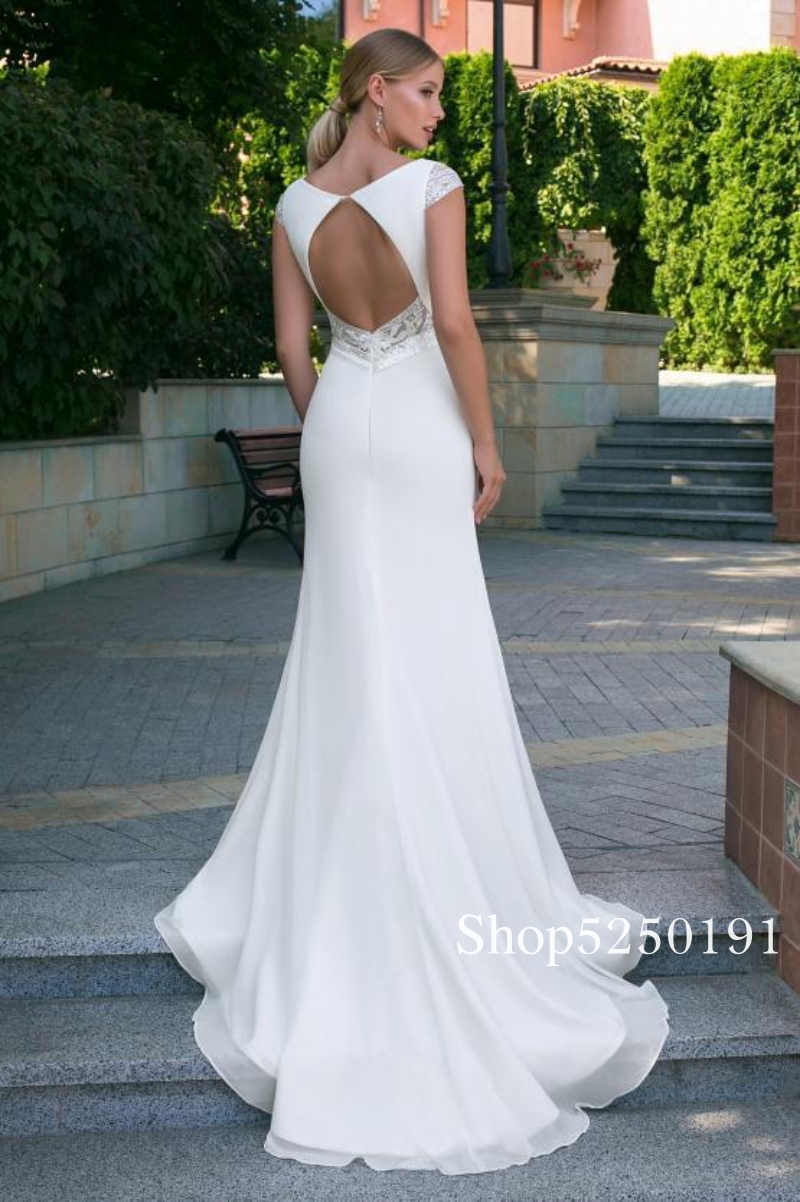 V-Neck Short Sleeve Satin Backless Sheath Wedding Dress Sweep Appliques Bride Dress Bohemian Beach Boho