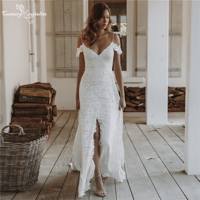 Beach Wedding Gowns Boho Bride Dress with Slit Spaghetti Straps Backless Off Shoulder Bohemian Bride Gowns