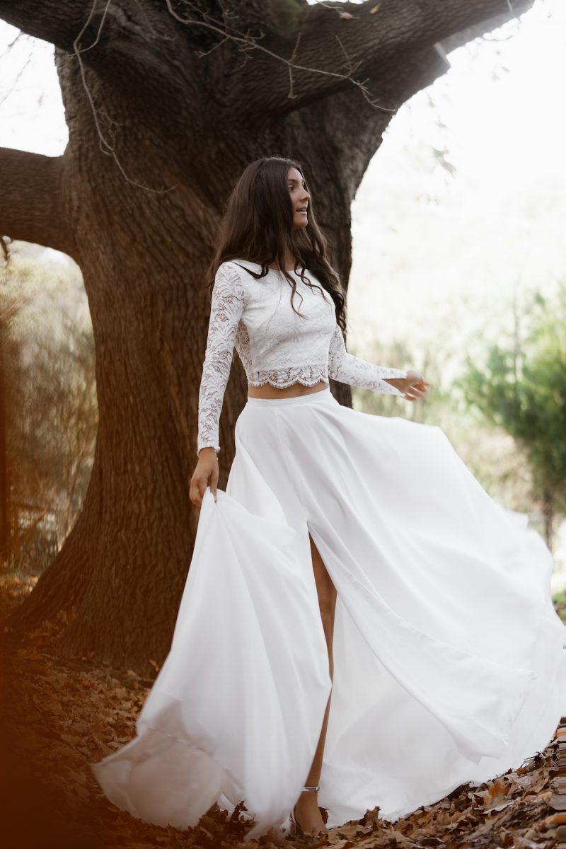 Bohemian Two Pieces Wedding Dresses Bridal Gowns Long Sleeve Lace Split Chiffon Skirt