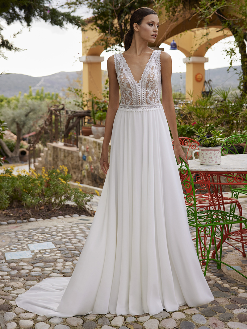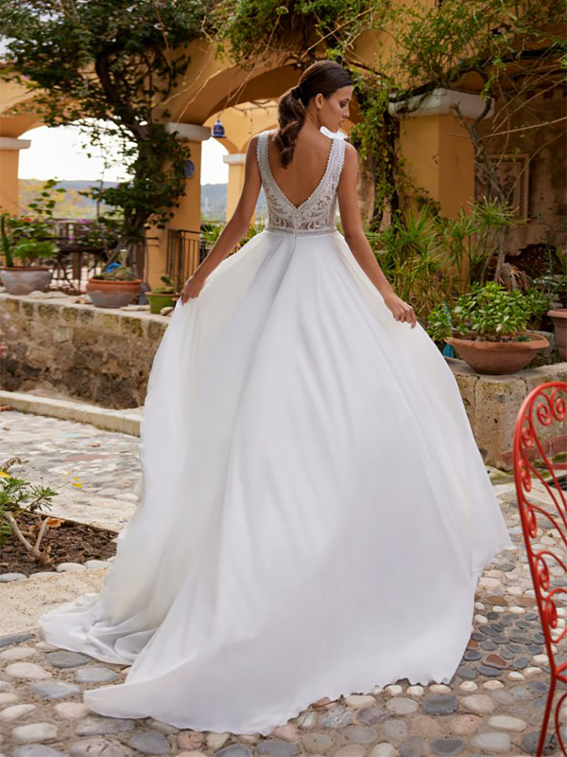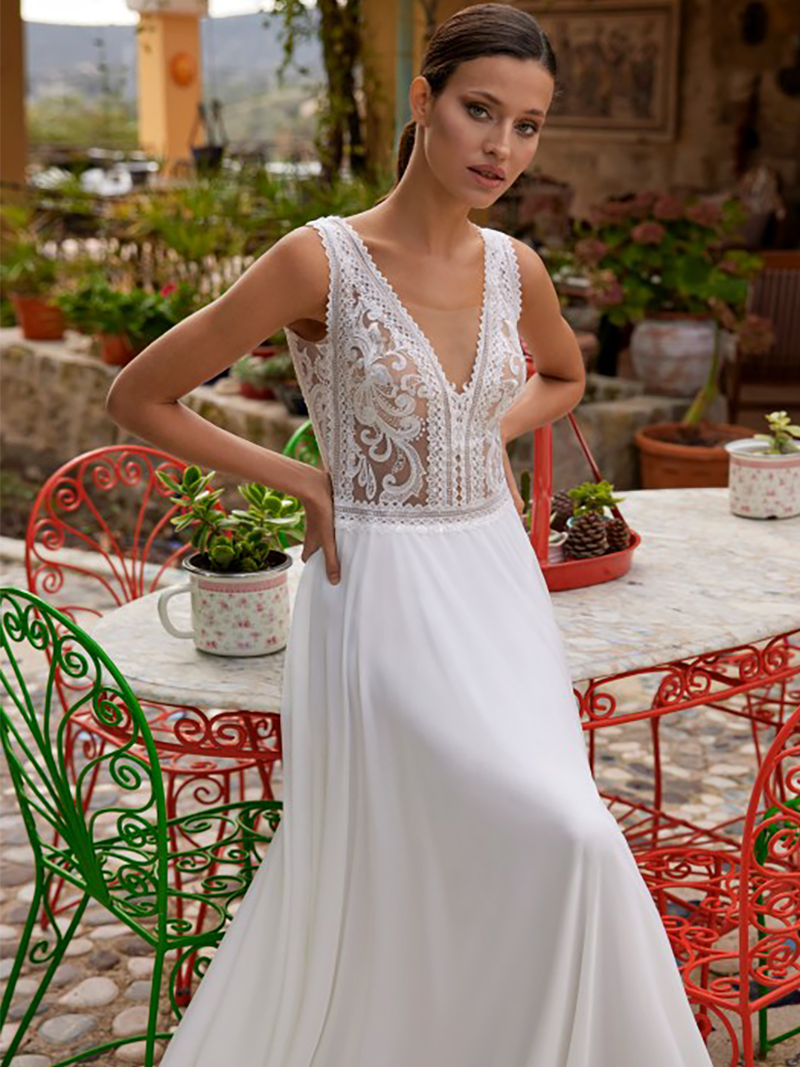 Boho Summer Beach Wedding Dress Backless Appliqued Lace Chiffon Short Train V-Neck Backless Bridal Gowns