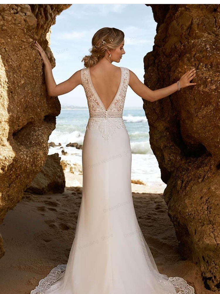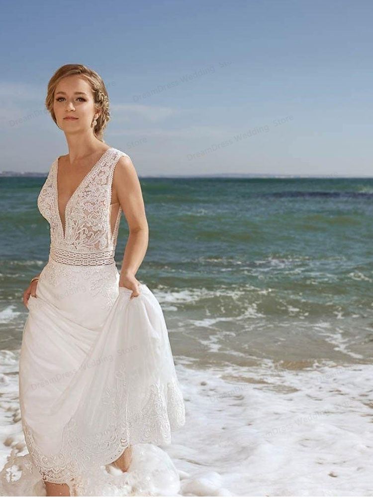 Boho Wedding Dress V-Neck Beack A-line Backless Sweep Trian Lace Appliques Cheap Custom Made Women Bridal Gown