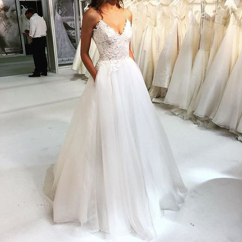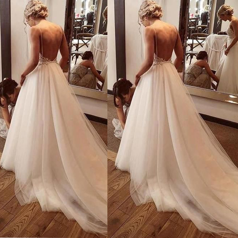 Boho Wedding Dresses Beach for Women Spaghetti Straps Sexy Backless Tulle Wedding Gowns
