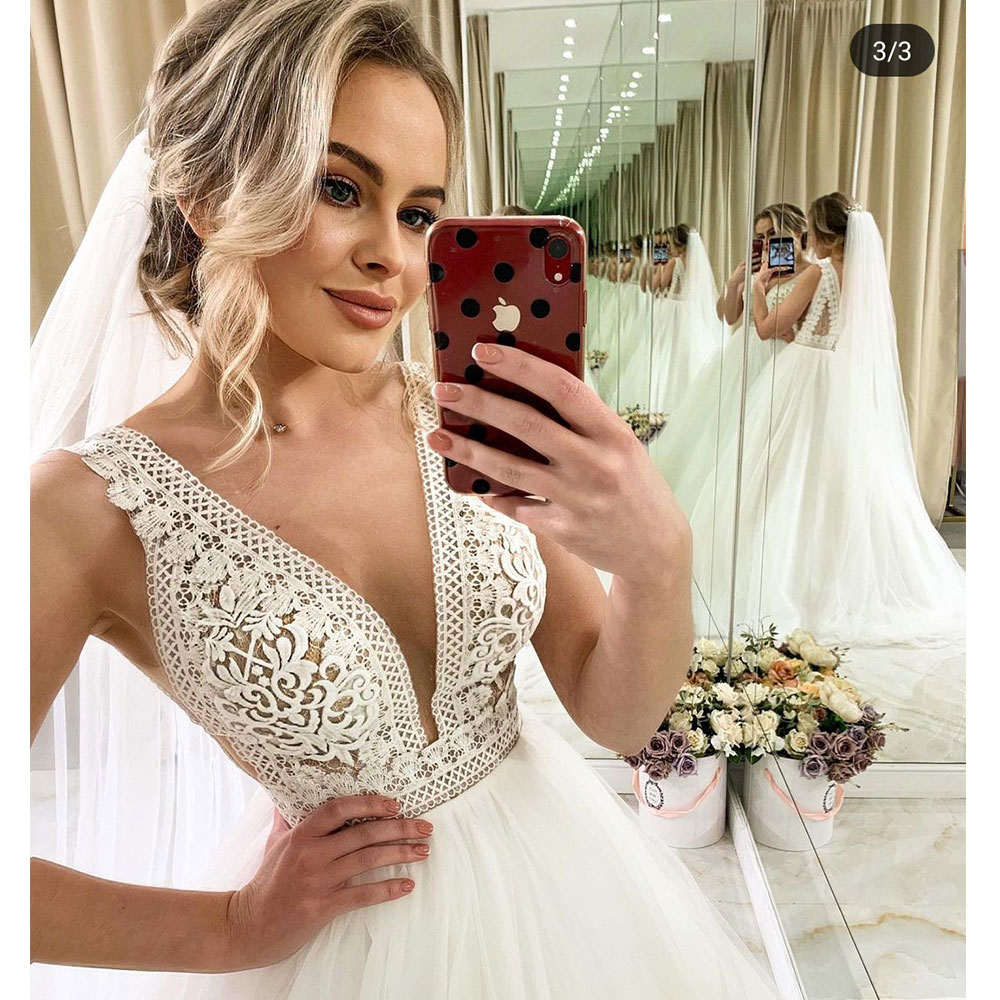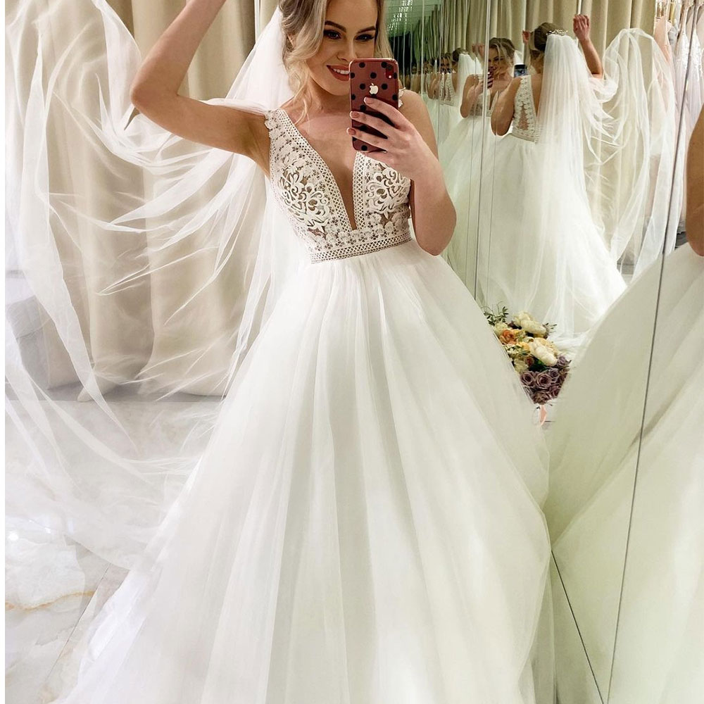 Elegant A Line Wedding Dress Sexy V Neck Boho Tull Bridal Gown