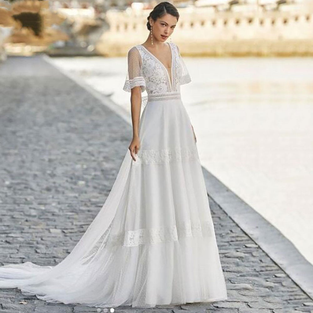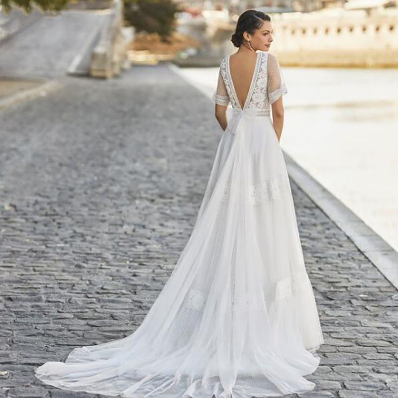 Elegant Wedding Dress Boho V Neck Sexy Backless Robe De Mariee Lace Appliques Vintage Lace Formal White Ivory Bridal Gowns