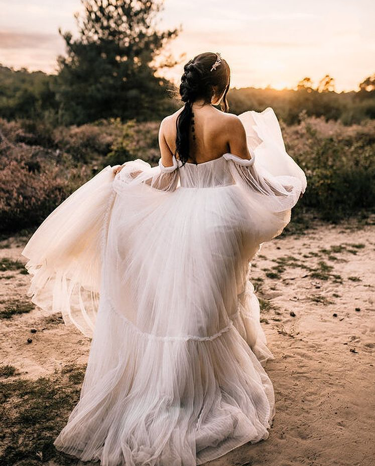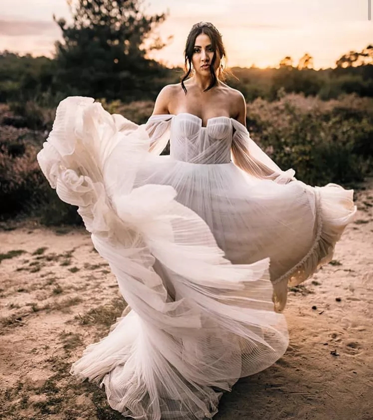 Flowy Pleated Tulle A Line Wedding Dress Lantern Sleeve Charming Off The Shoulder Bridal Gowns Simple Boho