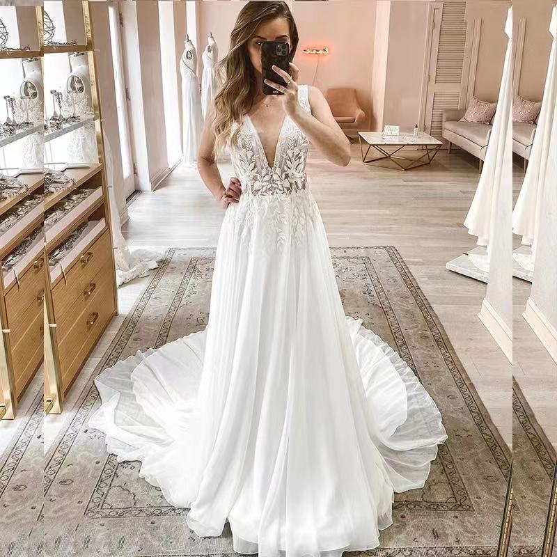 Princess Wedding Dress Sexy V-Neck Sleeveless Boho Sweep Train Chiffon Robe De Mairee Wedding Dress