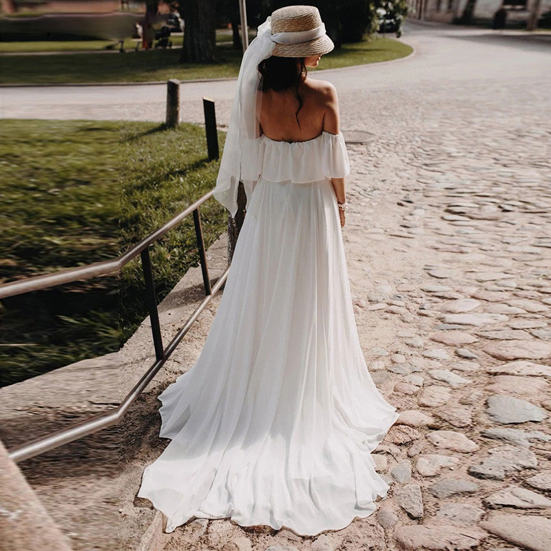 Simple Chiffon Boho Wedding Dresses Off The Shoulder Side Split Beach A-Line Cheap Wedding Party Gowns