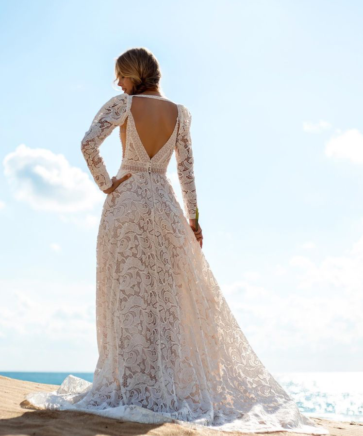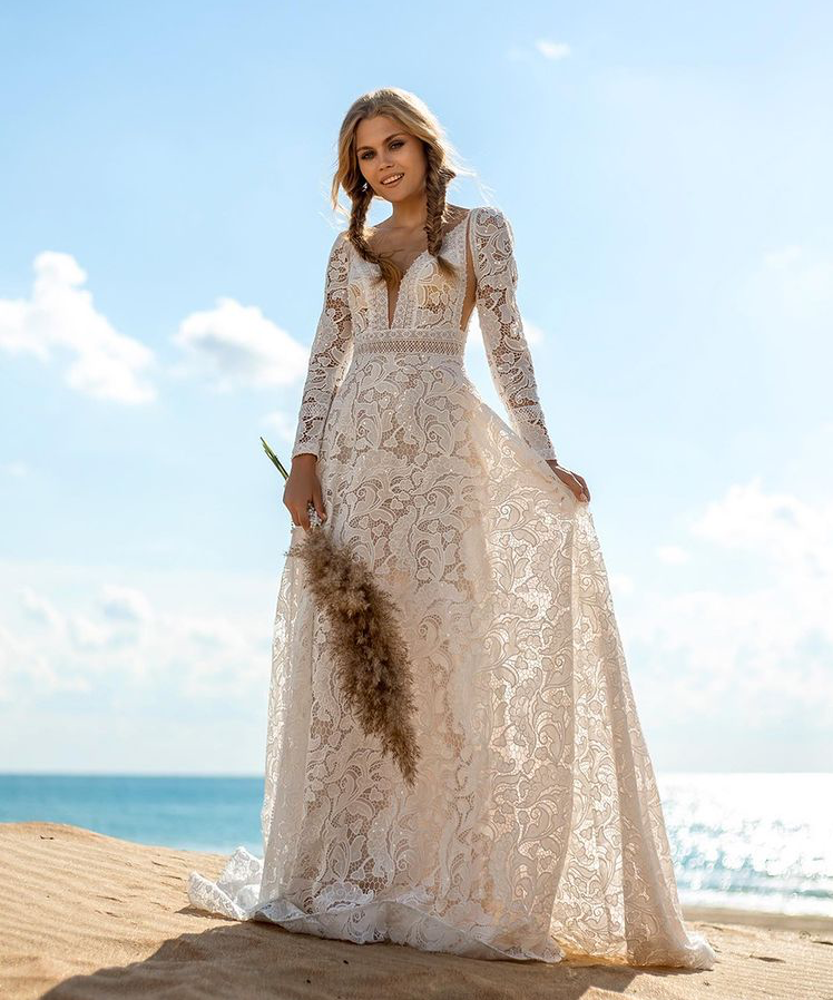 Unique Embroidery Long Sleeve Boho Wedding Dress Chic Beach Sexy Deep V Open Back Bohemia Bridal Gowns