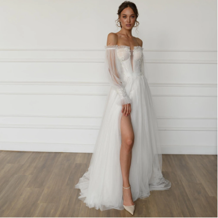 A-Line Bohemian Wedding Dress Boat Neck Long Lantern Sleeve Bridal Gowns