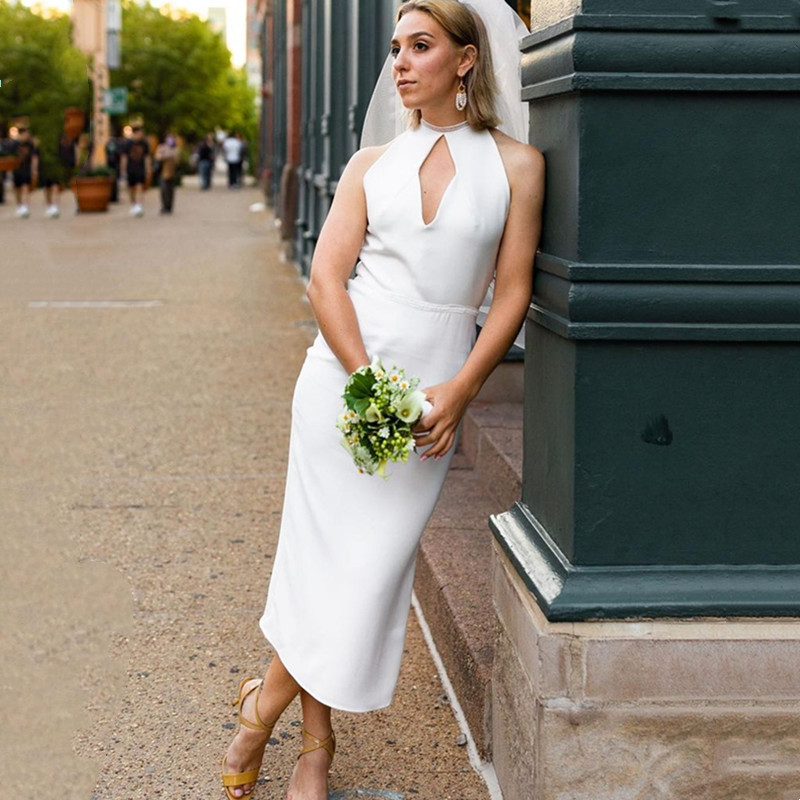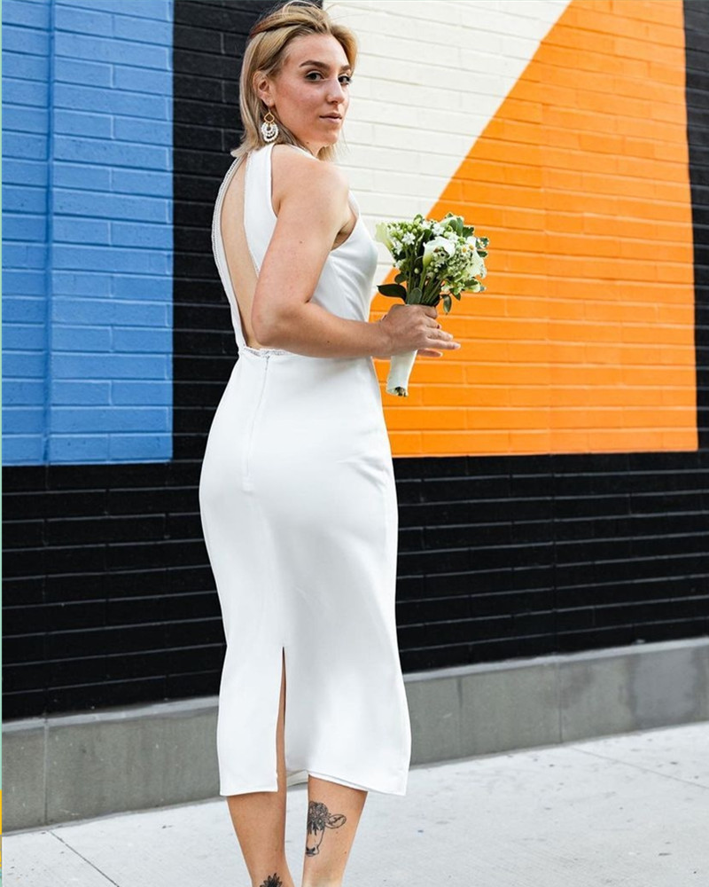 Bohemian Sxzy Wedding Dress Split High Neck Sleeveless Sheaath Satin Mid-Calf Bride Gown