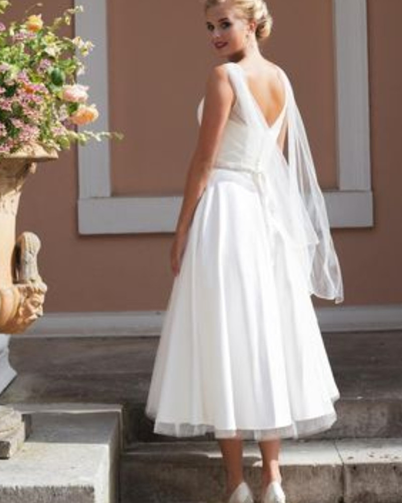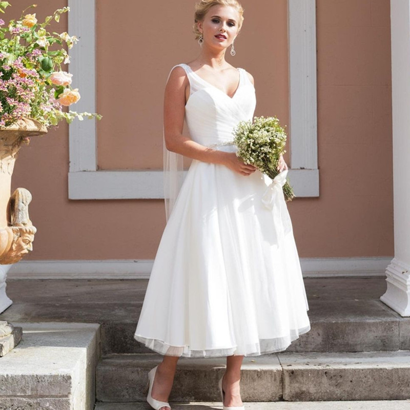 Boho Simple Wedding Dresses A-line Mid-Calf Backless V-Neck Sleeveless Tulle Satin Bride Gown