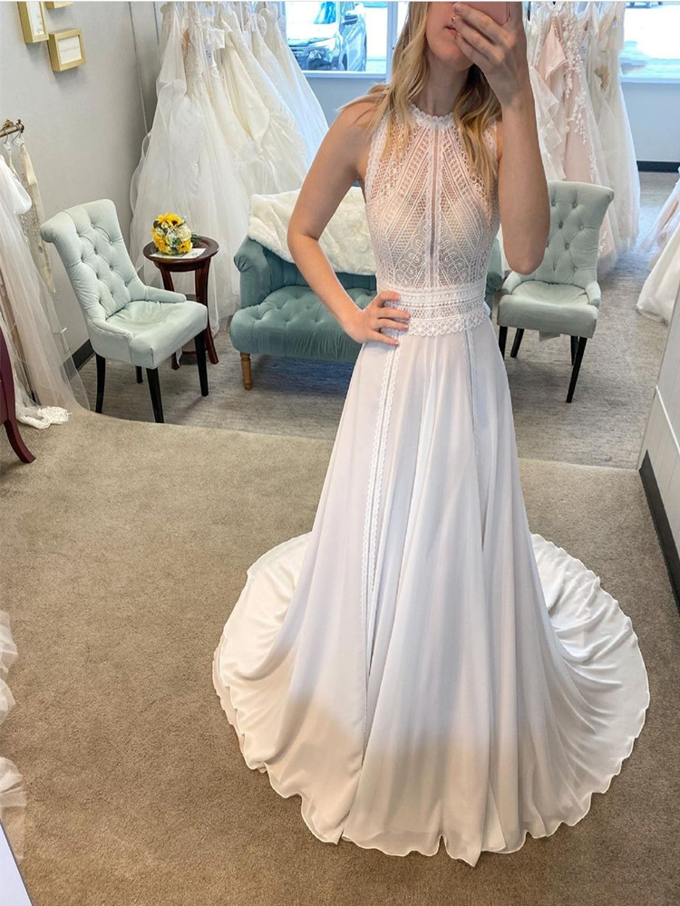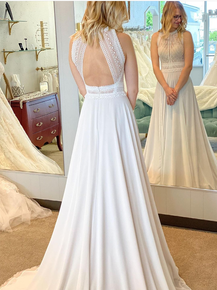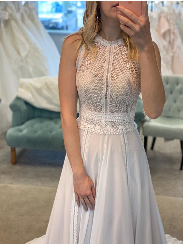 Elegant Bohemian Wedding Dress Lace Appliques O-Neck Sleeveless Sweep Train Backless Chiffon Satin Cut-Out Design For Women