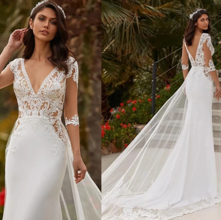 Summer Ivory Satin 3/4 Sleeves Mermaid Wedding Dresses Boho V Neck Floor Length With Long Train Vintage Bridal Gowns