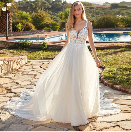 Best Selling V Neck Sleeveless Bridal Dresses A Line Appliques Court Train Bohemian Beach France Bride Dresses